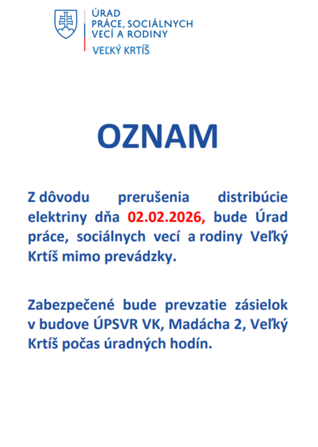 Úrad práce, sociálnych vecí a rodiny Veľký Krtíš mimo prevádzky z technických príčin