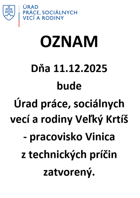 Dňa 16. 08. 2024 bude Úrad práce, sociálnych vecí a rodiny - pracovisko Vinica zatvorený z technických príčin